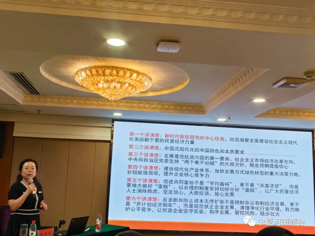 讲座邀请北方民族大学经济学院教授、“六个讲清楚”宣讲提纲编写组成员张晓凤,就新时代新征程党的中心任务、中国式现代化的中国特色和本质要求、促进共同富裕等内容进行了宣讲。引导民营企业家要深刻领悟“两个确立”的决定性意义,在正确理解党中央的方针政策中坚定发展信心、坚定道路自信,要把握大势,在高质量发展中促进共同富裕。