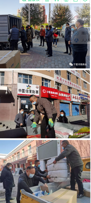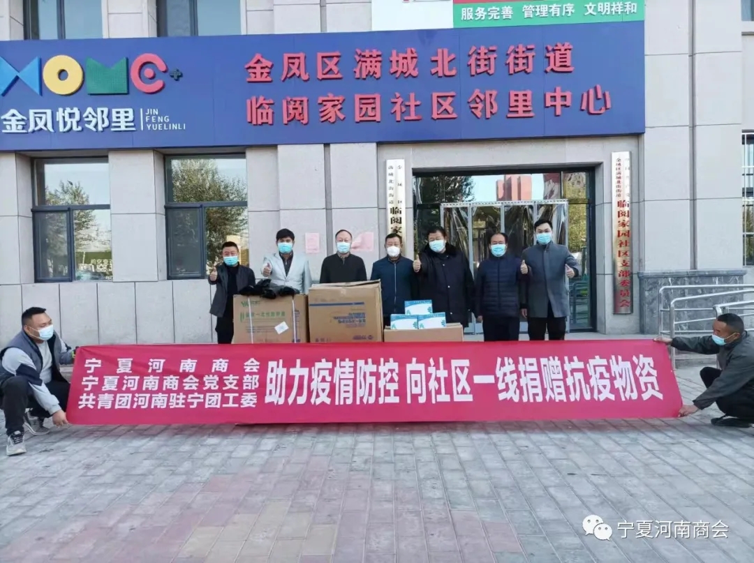 2021年11月8日,宁夏河南商会执行会长秦东方、商会党支部书记张金刚、常务副会长(团河南驻宁团工委书记)王志昌、副会长(团河南驻宁团工委副书记)郭昆仑、李长运等一行代表宁夏河南商会、宁夏河南商会党支部、共青团河南省委驻宁团工委,带着会员单位捐赠的隔离服、N95口罩、医用手套、折叠床、被褥、黄大衣、消毒酒精、大号垃圾袋等防疫物资,分别向银川市金凤区黄河东路街道双渠口村居民委员会、银川市金凤区满城北街街道中强巷社区、银川市金凤区满城北街街道临阅家园社区捐赠。 金风区副书记、政法委书记邵中宏、金风区党办副主任李东东、各街道办事处书记等出席此次捐赠活动,并接受所捐物资。