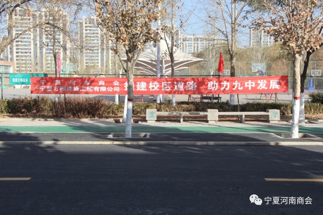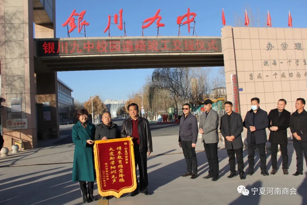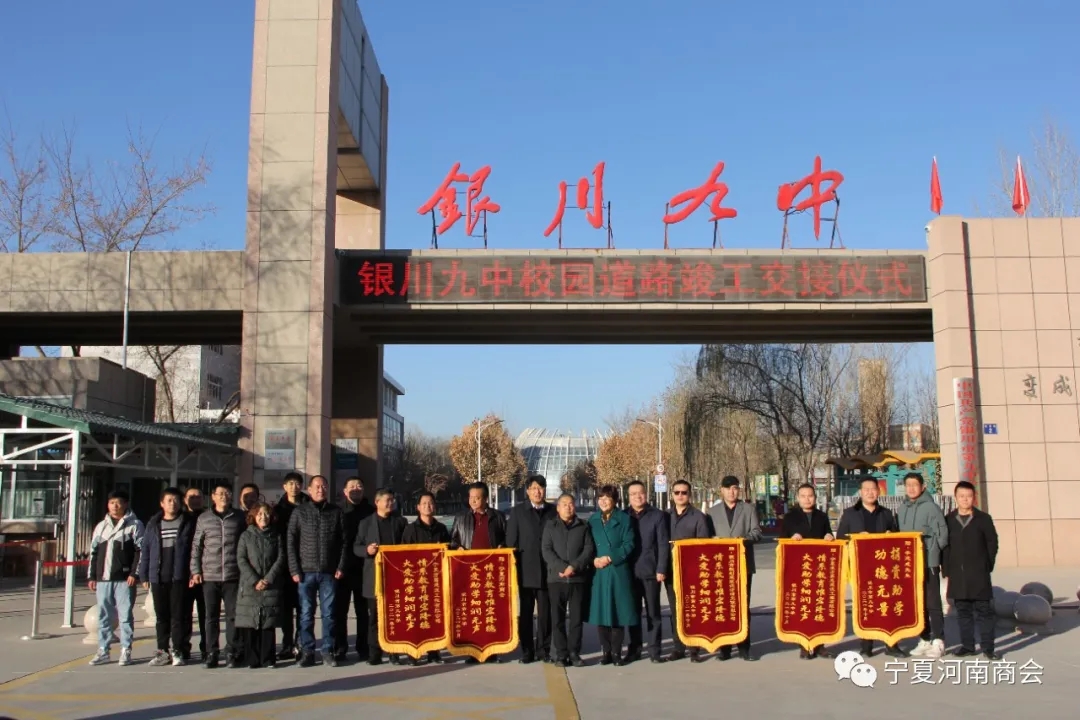 11月25日上午9时,嫩寒侵衣,阳光熠熠。在银川市第九中学东门口隆重举行校园道路竣工交接仪式。宁夏河南商会会长、宁夏方圆建设工程有限公司董事长华贵普、宁夏河南商会秘书长陈三同、监事长李建成、副会长王玉龙,银川市建筑规划设计研究院乔志赟院长,九中党委书记王锦秀、校长王少云等40余人参加了仪式。此次捐建的校园道路,投资150多万元。主要由宁夏方圆建设工程有限公司出资并施工,宁夏规划设计院有限公司、宁夏河南商会李建成、王玉龙参与捐建。