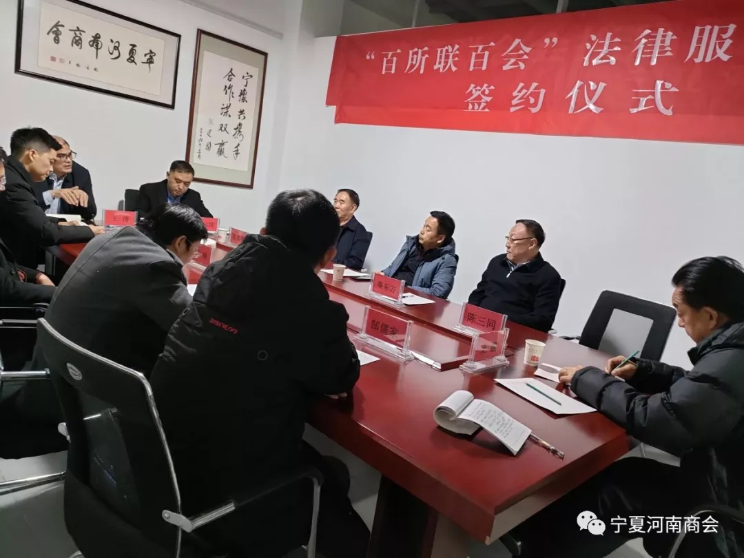 2021年12月15日下午,“百所联百会”法律服务合作签约暨宁夏河南商会法治工作委员会专题会议在商会办公室召开。商会执行会长、法治工作委员会主任郝运清主持会议,商会会长华贵普、名誉会长海宪甫、执行会长秦东方、秘书长陈三同、律师庞麟、陈曦、马浩、黄恒林、郜儒家、王涛、韩宾等参加会议。