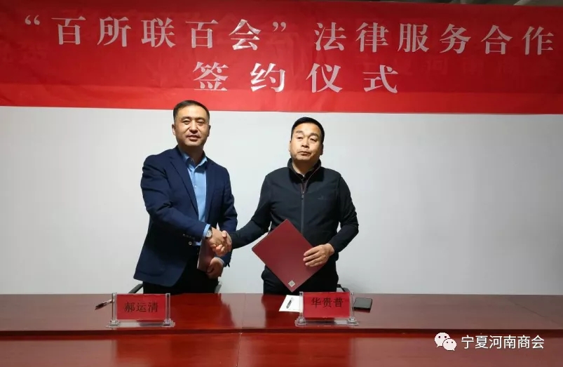 郝运清主任代表宁夏兴业律师事务所和宁夏河南商会签订了“百所联百会”法律服务合作协议书。