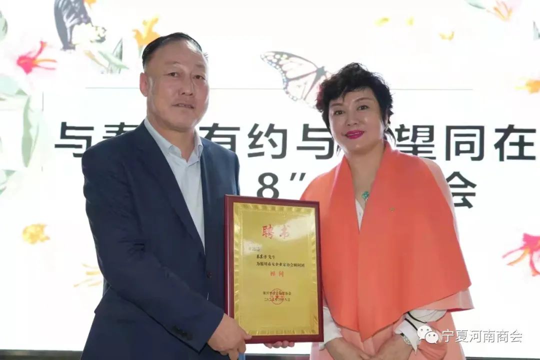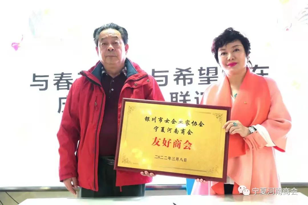 2022年3月8日下午,银川市女企业家协会召开联谊会,热烈庆祝三八国际妇女节。联谊会上,主持人隆重宣布:银川市女企业家协会与宁夏河南商会结为“友好商会”,聘请宁夏河南商会执行会长秦东方为银川市女企业家协会顾问,同时进行了授牌仪式。