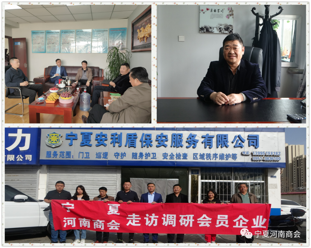 下午,商会轮值会长郝运清、副会长刘坤、会员李书安、秘书长陈三同等一行五人来到金凤区满城北街的宁夏安利盾保安服务有限公司。公司总经理李凤江介绍:宁夏安利盾保安服务有限公司成立于2010年,公司紧密结合保安市场实际和保安业的发展形势,以“高素质、高技术、高质量、高层次”为建设目标,强化自身建设,以“带专业队伍、争优质服务、打造服务品牌,以信誉取胜”。现有人员近1000名,服务80余家单位,主要有医院、学校、小区、法院等。公司安保服务人员进行岗前培训,合格后上岗;岗中回炉培训,加强服务能力,为业主提供更加优质的服务。