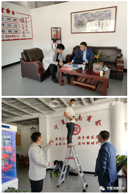 上午,轮值会长郝运清与商会副会长郭昆仑商榷后,决定为商会办公室形象墙安装射灯。副会长郭昆仑决定赞助安装并亲自到现场督导,调整光线,尽心尽责。并讨论了有关商会工作。