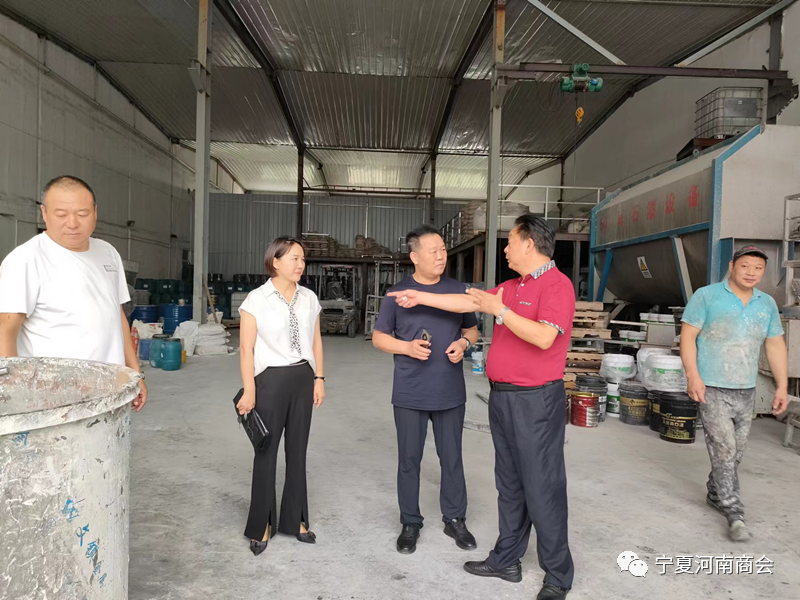 8月10日下午,商会轮值会长李建成、党支部书记张金刚、副会长朱国钦、秘书长陈三同等一行五人来到位于贺兰县兴发路与奥莱路交汇处的银川东方润彩建筑装饰材料有限公司。公司负责人宁卫军、刘思茹在门口迎上我们,热情地为我们介绍公司经营状况:公司是今年才搬迁过来的,现在把公司办公与生产集中在一起,方便管理,节约成本。现有1600多平的场地,足够生产用,今年产品销售较稳定。
