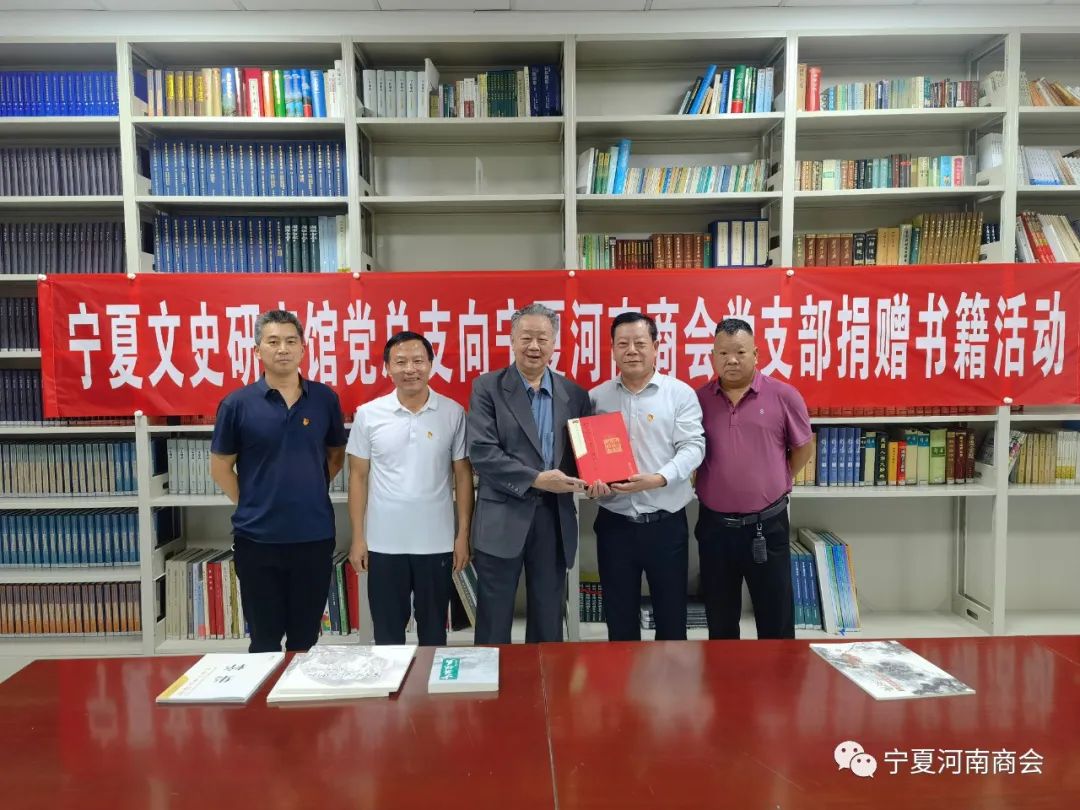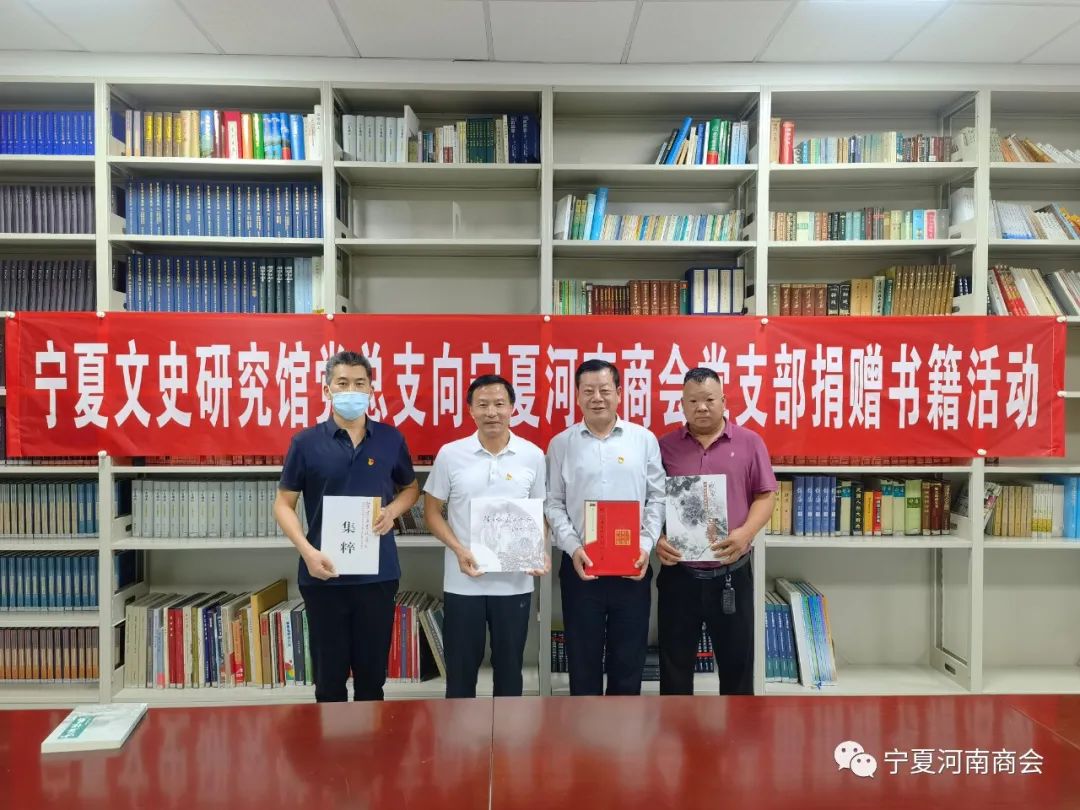 宁夏文史研究馆党组成员、副馆长、党总支书记丁克家、党总支副书记赵连发、宁夏文史研究馆馆员柴建方、宁夏河南商会党支部书记张金刚、会员刘现锋参加捐赠书籍活动。